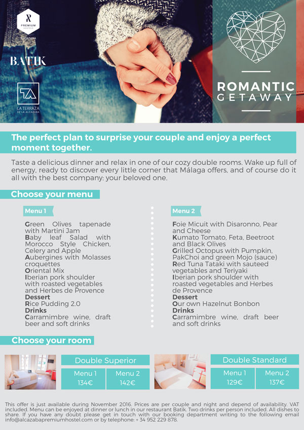 What better way to complement any of these five romantic getaways than with a visit to our hostel in the heart of downtown Malaga? Now at Alcazaba Premium Hostel we make it easier than ever during this month of November with our new special promotion.